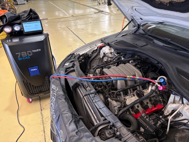 エアコンのホースが作業の障害になりますのでA/Cガス抜きましてホース取り外します