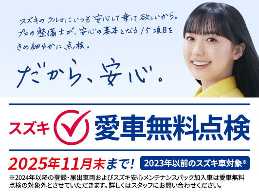 スズキ愛車無料点検 イベント 2025.09.19 スズキ愛車無料点検では、お乗りのスズキ車で15項目の点検を無料で受けられます。 ご予約は Car Service 光明池 0725-56-0818 まで 前の記事へ一覧へ次の記事へ CATEGORYニュース 新着情報一覧 SDGsイベントお知らせこれまでの車両販売実績コンセプトカーリクルート 2025年10月 月 火 水 木 金 土 日 « 9月 12345 6789101112 13141516171819 20212223242526 2728293031
